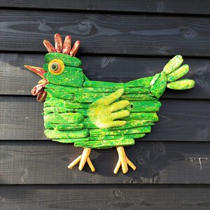 2022De groene kip Kippen worden wel geassocieerd met een 'nieuwe start' in het leven. In sommige culturen duiden kippen op veel geluk. Bij ons thuis geeft het onderwerp kippen stof tot discussie, want: nemen we nu wel of geen kippen? Het zijn fantastisch leuke beesten, maar het hok zal ook schoongemaakt moeten worden. Drie keer raden wie dat dan mag doen? Dus probeer ik het nog even tegen te houden en maak ik af en toe een gezellige kip van drijfhout. Waarschijnlijk zal het niet lang duren voor we hier toch een paar kippen hebben rondlopen. De hoek van de tuin is namelijk al helemaal gereed gemaakt voor een paar van die eierenleggende dames. Voor de groene kip is één spijker, haakje of schroefje in de muur voldoende. Met zo'n beauty aan de muur kan het haast niet anders of het geluk zal je toelachen.