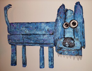 2022Blauwe hond De blauwe hond hangt op dit moment boven mijn bank. Qua kleur past dat niet helemaal in mijn woonkamer, maar het is echt een plaatje om naar te kijken. Ik geniet er elke dag van. Hij kijkt ook zo grappig de wereld in met zijn ogen van plastic doppen.