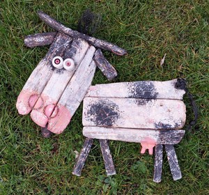 2022Vrolijk varken Dit varkentje zul je niet zomaar even wassen. Zij is namelijk 74 bij 50 centimeter groot. Wist je dat in oude culturen het varken een teken was van vruchtbaarheid en welvaart? Ook als je droomt over een varken wordt dit als een gunstig teken beschouwd. In de Middeleeuwen gebruikte men varkens om het stadsvuil op te eten. En omdat straatvuil ratten aantrok en ratten weer de pest verspreiden, zag men varkens als beschermers tegen de pest. Sommige varkens kregen een belletje om hun nek. Dit varken heeft een ketting om haar nek gemaakt van o.a. een plastic dop, slakkenhuisjes van het formaat alikruik, waar kleine heremietkreeftjes graag in schuilen. Met in het midden een belemniet, gevonden in Denemarken. Dat is een deel van het skelet van een inktvisachtige die leefde in de jura en het krijt tijdperk. Kortom: weer een uniek exemplaar.